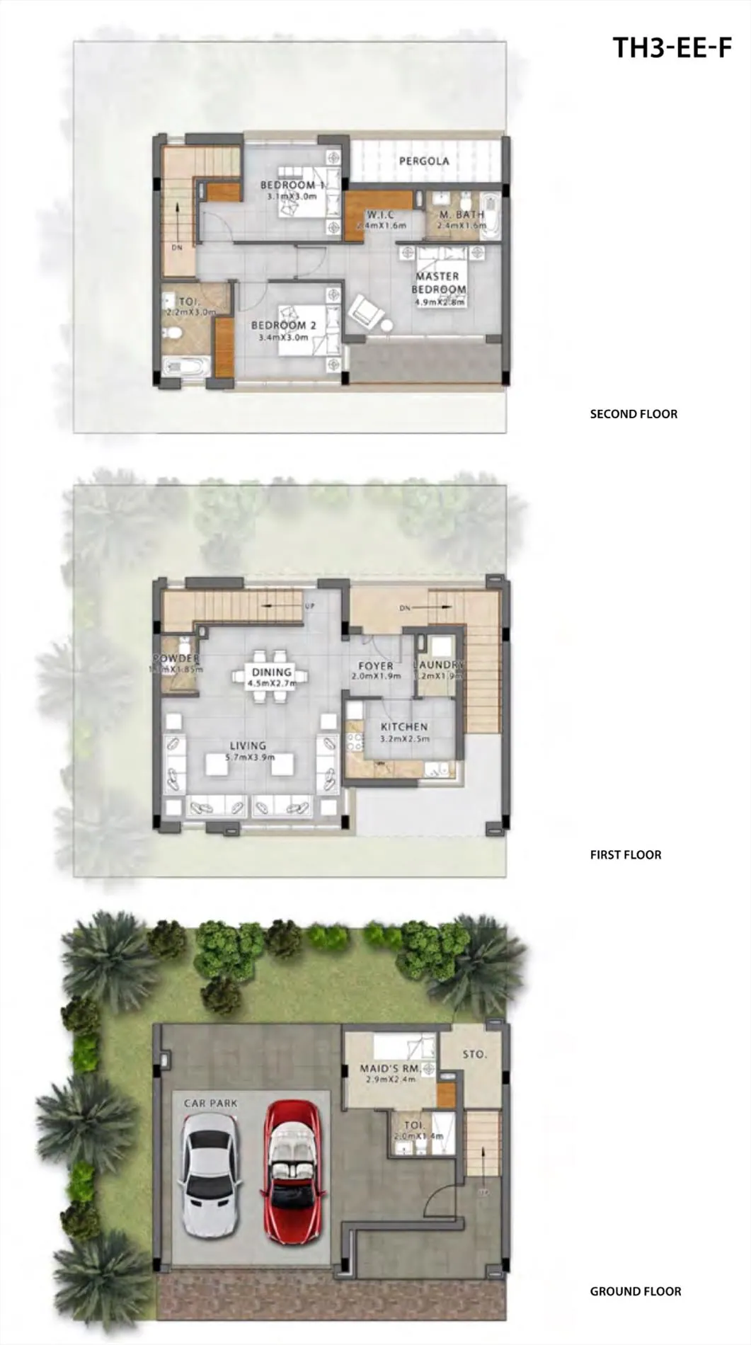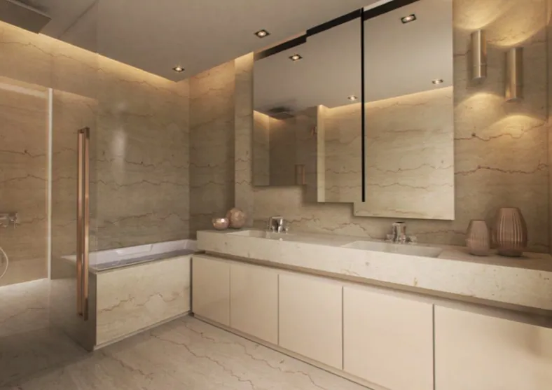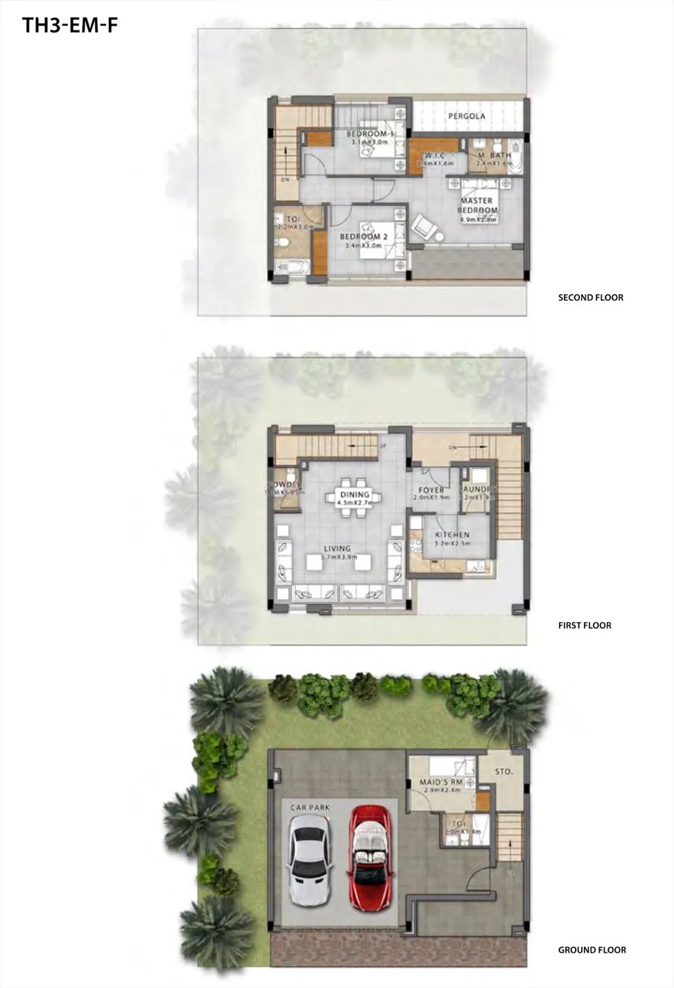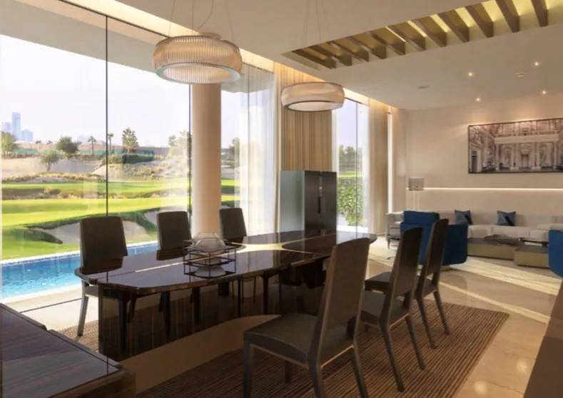 De beste elementen van de typische levensstijl van Beverly Hills werden naar Dubai gebracht in de ontwikkeling van deze spectaculaire limited-edition en op Fendi-geïnspireerde villa. Deze werd tot in de puntjes afgewerkt met luxueuze materialen zoals houten vloeren en marmeren tegels. De indeling is als volgt: naast de inkom bevindt er zich een ruime carport goed voor twee parkeerplaatsen. Op het eerste verdiep kan men naast de wasruimte en de keuken, ook een zeer ruime en gezellige eet- en leefruimte terugvinden. Verder is er ook een apart toiletje aanwezig. Op het derde verdiep tenslotte, zijn er 2 slaapkamers, een badkamer en een master bedroom met privébadkamer aanwezig. De gevelhoge ramen zorgen voor natuurlijk licht in alle hoeken van deze luxueuze villa.