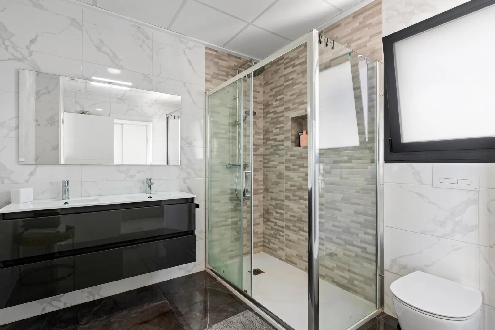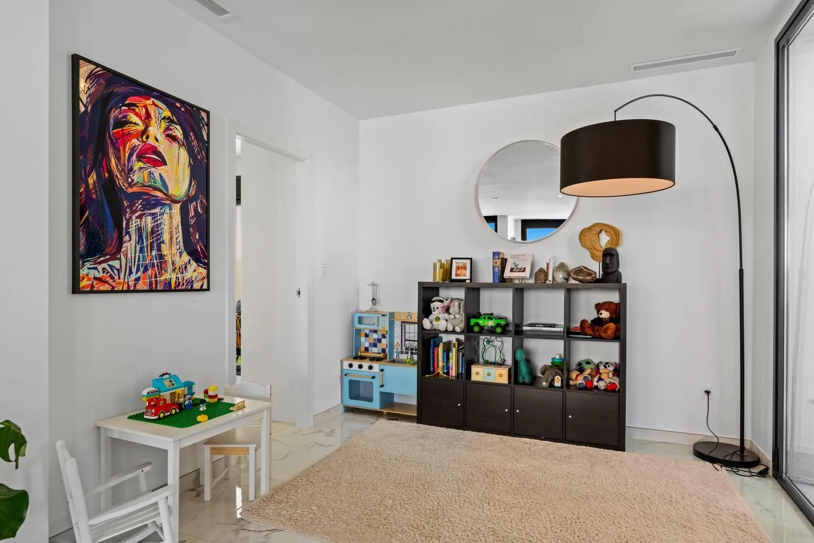 De grote ramen van deze prachtige kamer vullen het huis met het warme licht van de Middellandse Zee en verenigen het interieur met het terras en de tuin, en vooral met het zwembad. Een ware oase waar u de dagen en nachten zult doorbrengen, plezier maken, lachen en genieten met de uwe. De villa beschikt over een privézwembad van 7x3M met ingebouwde waterval. Tevens bestaat de mogelijkheid om uw auto op uw eigen oprit te parkeren.